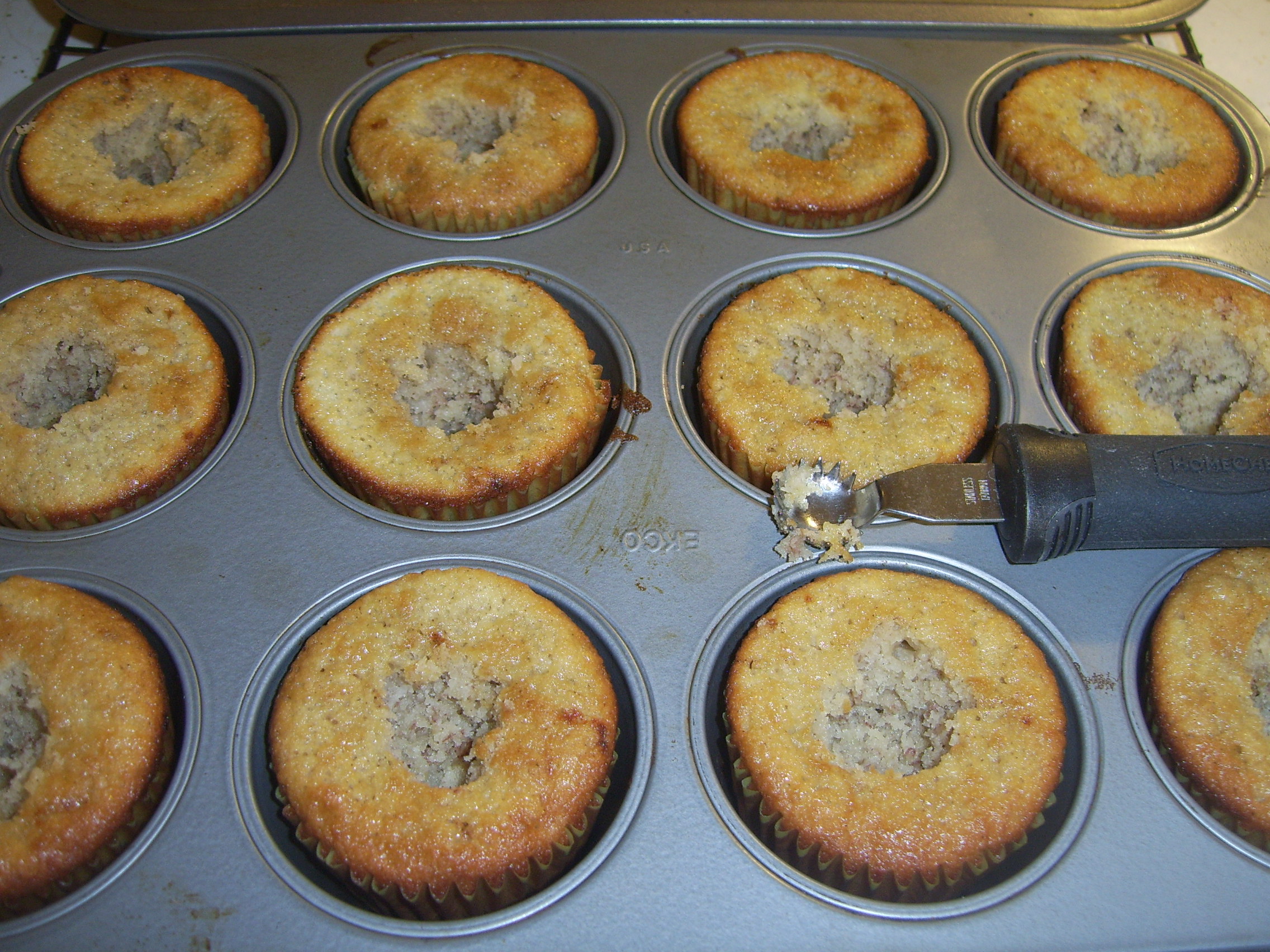Take them out; cool on a wire rack. Once they are cooled completely, now it’s time for some minor surgery. You will only feel slight pressure… :-)Using an apple corer; go down about 1/2 way, and you are going to remove a