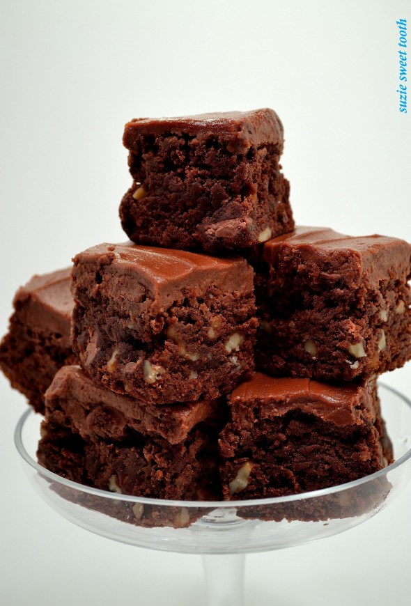 Years ago when I lived in Michigan I worked at this hospital that had these amazing brownies with chocolate frosting. They used to park those suckers [all neatly wrapped in plastic wrap] right next to the cashier so you saw them when you were checking out with your boring chicken ala king. Yeah, just try to ignore those beauties, that chocolate frosting glistening right through that plastic. I worked night shift for 11 years. You know the 4:00 Pm lull you get everyday when you think you can’t hardly make it until 5:30? Well working night shift, it’s that 3:00 Am slump that is the equivalent. Let me tell you, there is nothing like a thick, rich, chocolatey brownie iced with frosting at 3:00 Am when you are draggin butt. Just add coffee and you’re good to go. I dedicate this brownie to all the Nurses and any other hardworking souls working grave yard shift out there- and you know with us Nurses- CHOCOLATE IS A FOOD GROUP.