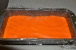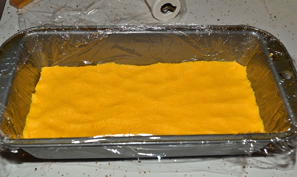 4. Line a loaf pan with plastic wrap. Starting with the non colored dough press the dough into the bottom of the lined pan. Top that with the yellow cookie dough and press into place so it is flat and smooth. Top with the orange dough and smooth and flatten and place a piece of plastic wrap directly on top of the dough and refrigerate the dough for a couple of hours at least until the dough is cold and firm enough to cut.