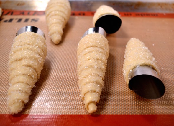 2. Once the horns are completely wrapped brush each horn on one side with water and press into coarse sugar. Place the pastry horns on a Silpat or parchment lined baking sheet with the sugar side facing up and chill for at least 30 minutes.