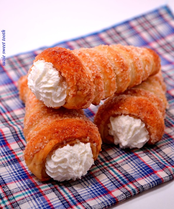 Cream horn. This little pastry gem falls under the category simple but tasty. So simple to make. Sure you can buy them at the store, but when you make them at home you can also know that they are fresh and have not been sitting there for God knows how long. Growing up my Mom used to buy cream horns at the store all the time. We weren’t really a twinkie kind of household. Explains a lot, no? When I was in pastry school and we learned how to make fresh puff pastry this little pastry treat was one of the recipes we made. You can make a million things with puff pastry and it’s handy to have a box in your freezer when the mood strikes you to make something tasty and easy. Our teacher in pastry school; the amazing pastry chef Nancy Pitta taught us to put a spin on the recipe and add a piped stripe of raspberry jam on the inside belly of the horn before piping in the cream. I will never make a plain cream horn ever again since that day. The raspberry jam totally makes this simple treat even better.