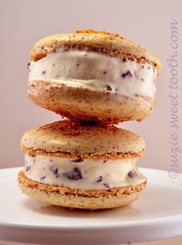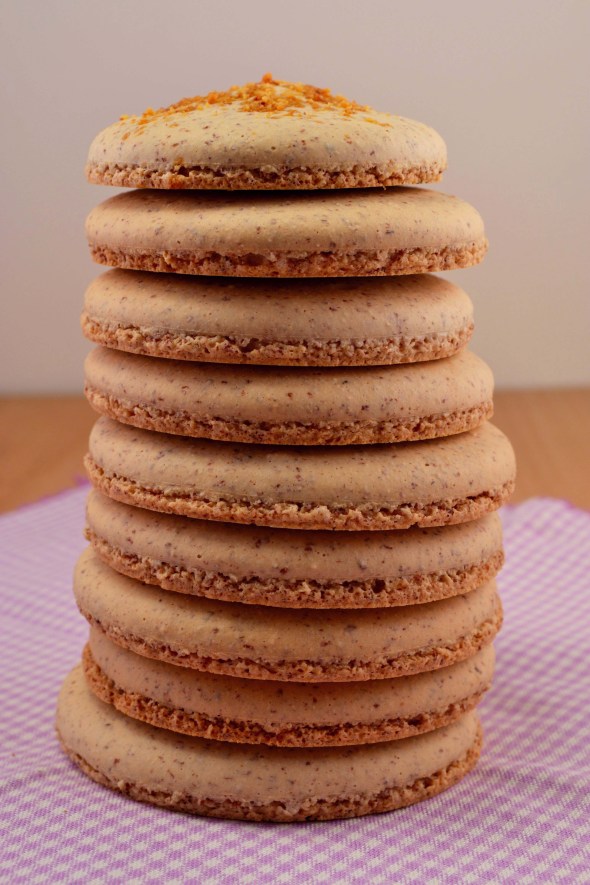 I can’t stay away from caramel. Not necessarily eating it, but baking with it. Okay, yes, I eat it too. I’ve said it before but it bears repeating;one of the most fascinating things about baking is how you can literally take a few ingredients and come up with something amazing. Caramel is one of those examples. If you have never made homemade caramel you must give it a try. Try my salted caramel recipe. Sugar, water and cream and you have caramel. You may have noticed I have a lot of posts with caramel. I could write a cookbook just with caramel recipes alone. Hmmm, might have to think about that….Anyway, here is yet another caramelicious post. I wanted to make extra-large caramel macarons to use for ice cream sandwiches. I’m planning on filling these with heath bar ice cream. Pralines and cream ice cream would be good too. You could also make regular size macarons and fill with salted caramel, caramel buttercream or vanilla buttercream.