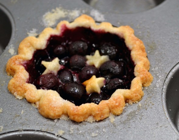 5. Fill each mini pie to the brim with the blueberry mixture, about 3 tablespoons for each pie. Top each pie with a decorative mini cut out if desired.