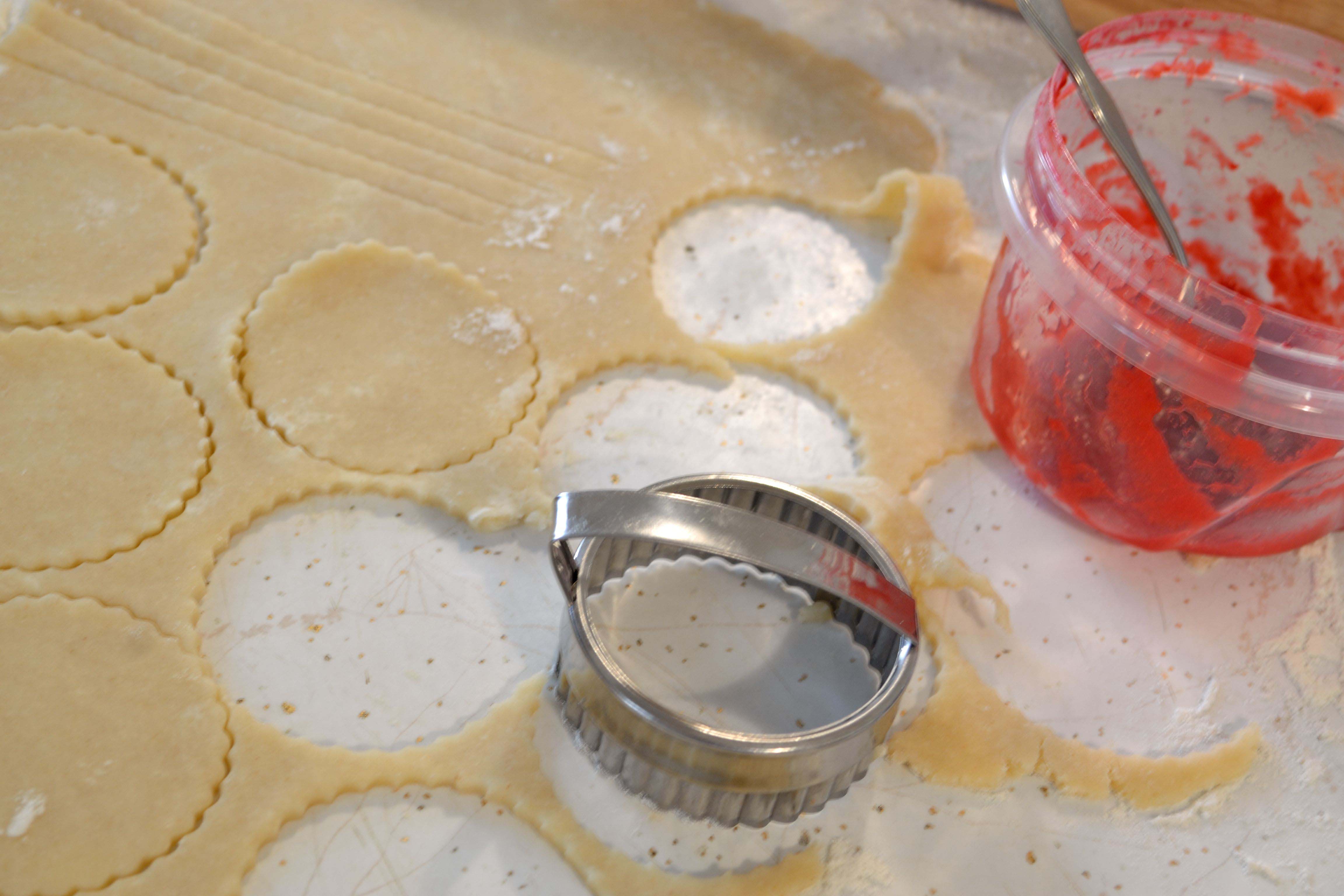 1. Roll out the pie dough to an even thin thickness. Using a 2 1/2 inch fluted cutter cut out rounds.