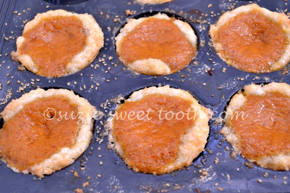 1. prepare a 24 well mini muffin tin and spray with baking spray or use a silicone mini muffin pan. Whisk all the filling ingredients in large bowl until combined. Set aside. Using the dough, pinch off enough to form about a 1 inch ball size. Flatten dough ball into a disk and press into the bottom and up the sides of each muffin well. Pour 1 Tbsp. of filling into each pie crust well. Brush each top edge of crust with cream and sprinkle with raw sugar or granulated sugar. Bake at 375 degrees F for 25 minutes. Because it is a custard;the filling will continue to cook even after removed from the oven and set thoroughly once cooled. The filling will puff up but will flatten once out of the oven.