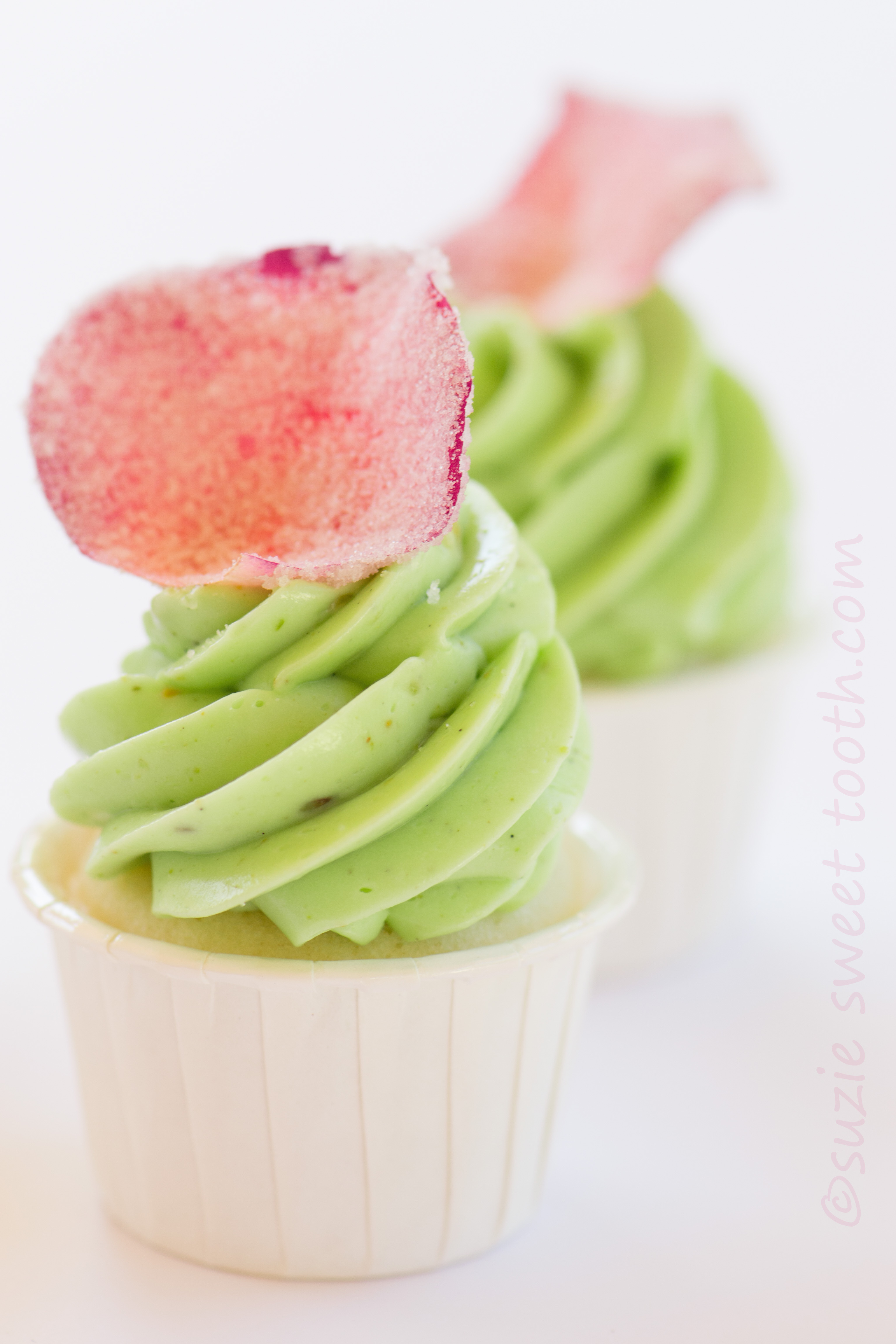 rose cupcakes with pistachio buttercream and sugared rose petals