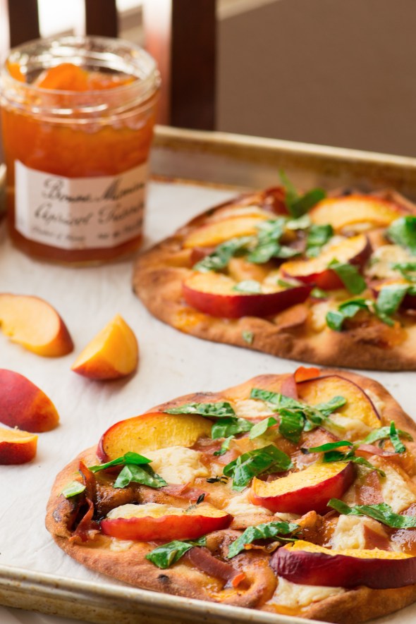 Do you like flatbread? My son and I will quite often share one while dining out. It’s a nice appetizer to share with friends or if you’re not super hungry. Peaches are in season now and they pair nicely with prosciutto. It’s a nice light alternative when you don’t want to eat something too heavy. Now I know it might sound weird to be firing up the oven to 425 on a hot Summer day, but they bake rather quickly once you’ve assembled them. Alternatively you could throw them on the grill as well and enlist some friends to help assemble. Cut into wedges and serve with a nice crisp white wine while lazing around the pool.