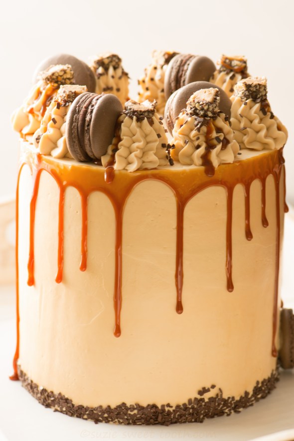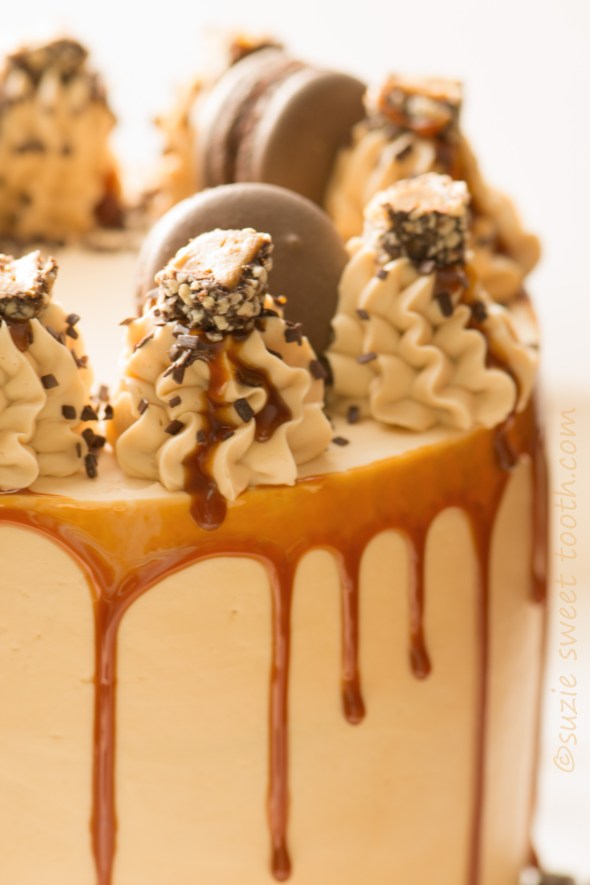 Assemble the cake with the toffee crunch buttercream as the filling and frost the outside of the cake with the salted caramel buttercream. Decorate as desired. Store the cake in the fridge until 1-2 hours prior to serving, remove the cake to come to room temperature.