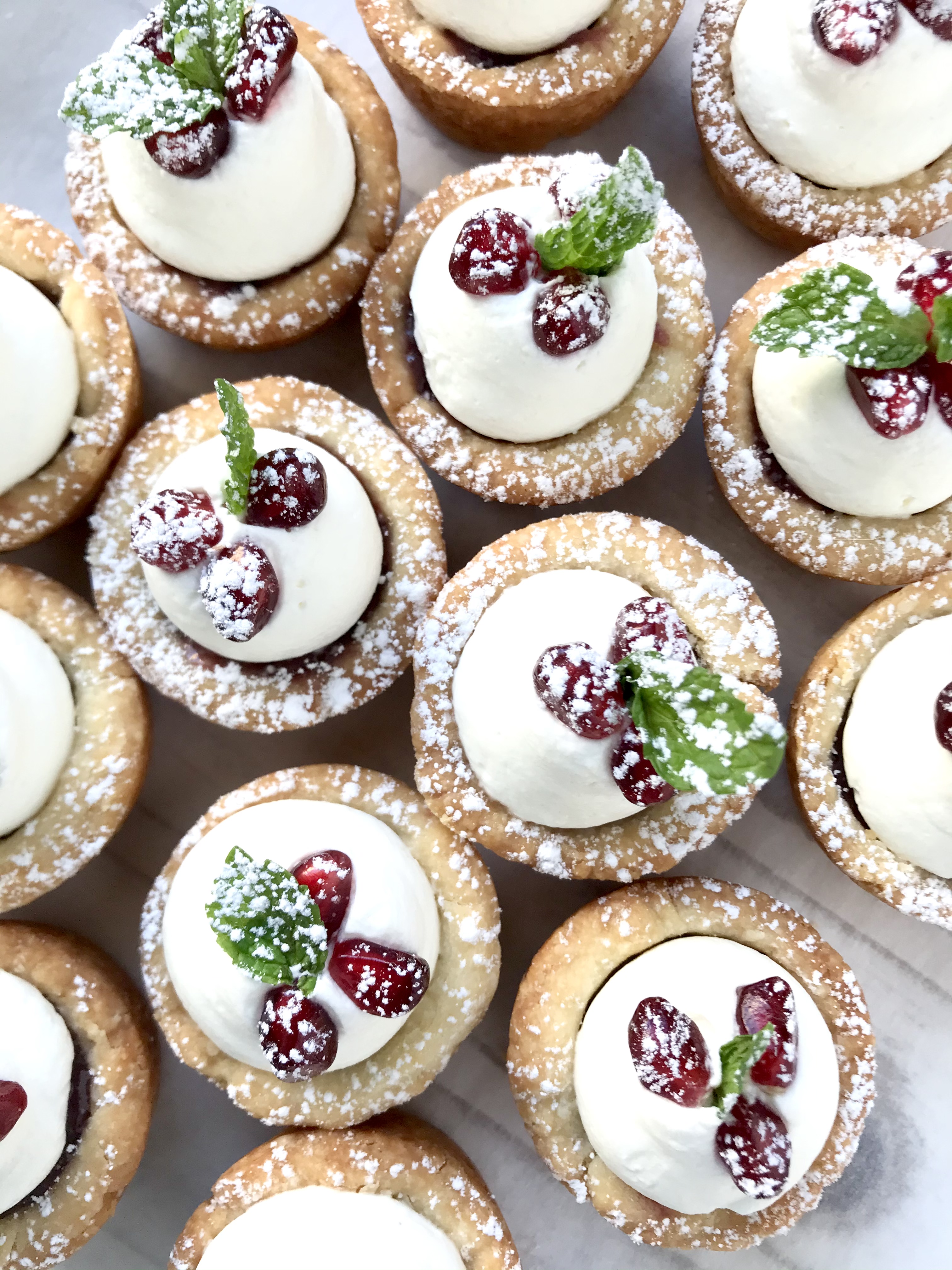 Remove the tart dough from the fridge and using a non stick mini muffin pan press about a 1 measured tablespoon size ball (14.5 grams) into the wells of each mini muffin well. Bake at 350 for about 15 -17 mins until lightly golden brown. Remove the tin from the oven and immediately use a rounded measuring 1/2 tsp. to flatten the bottom and sides if puffy. Let cool. When cool, top with pomegranate curd and top with stablized whipped cream, a few pomegranate arils and a sugared tiny mint leaf or a fresh cleaned mint leaf and sprinkle with confectioners sugar.