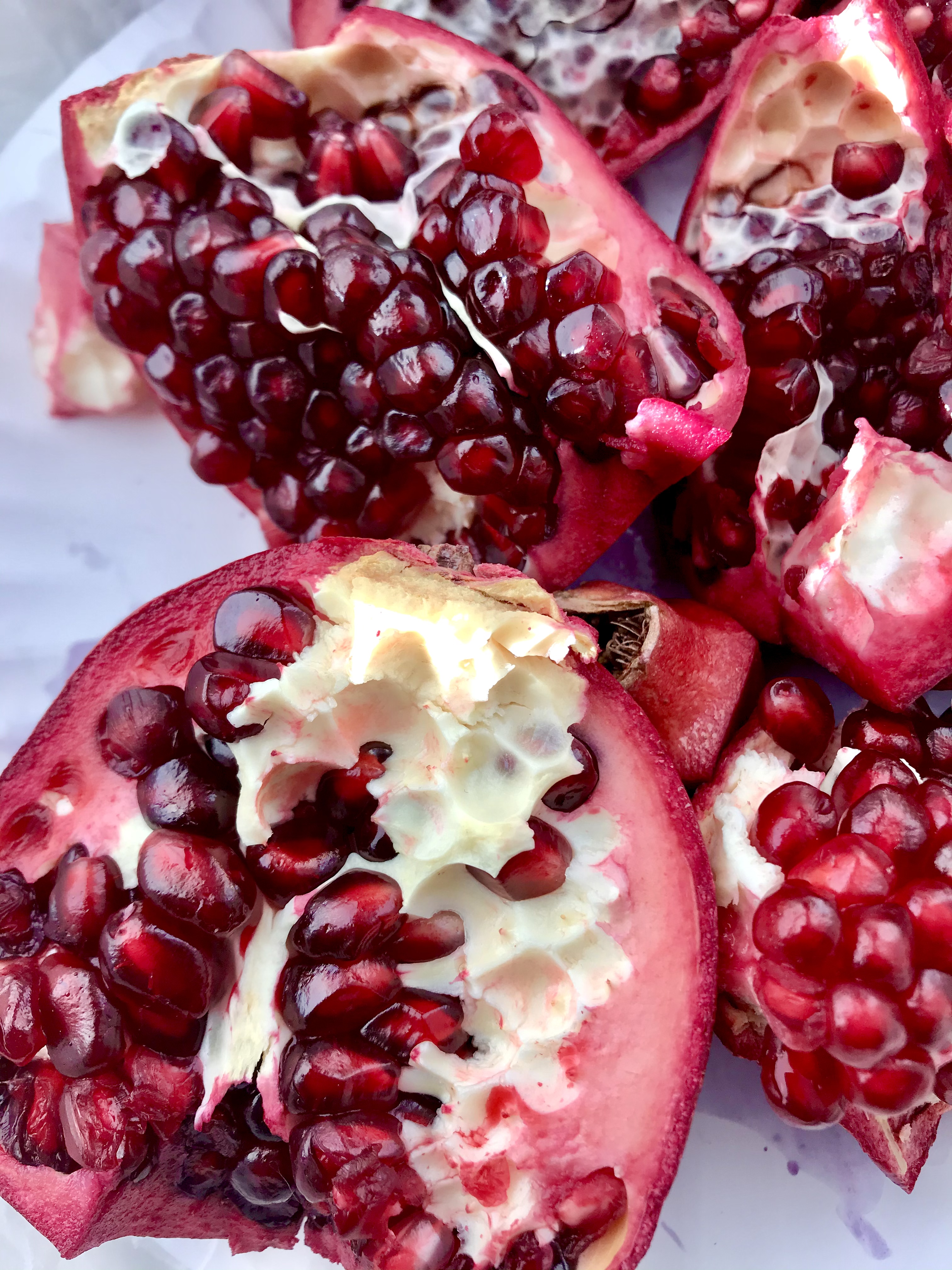 Quite often people are intimidated on opening a pomegranate, but it couldn’t be more simple. You simply cut down in an angle with 1/2 centimeter cuts around the crown-pop out the crown and then cut a series of 3-4 cuts down the sides of the pom with 1/2 cm cuts. Then using your thumb placed into where the crown was and pull back each section. The best was to release the arils is to have a deep bowl of cold water and place the sections up side down under the water and push out the arils. The white membranous pieces will float to the top of the bowl so you can scoop it out to toss. Once you have all the arils in your bowl then strain the contents through a strainer. There is nothing more beautiful than fresh pomegranate juice created by placing in a high speed blender. The color is stunning.