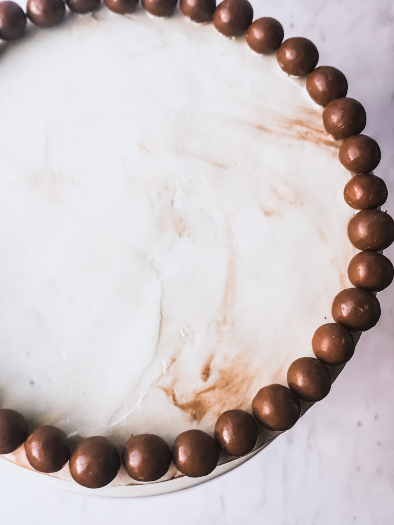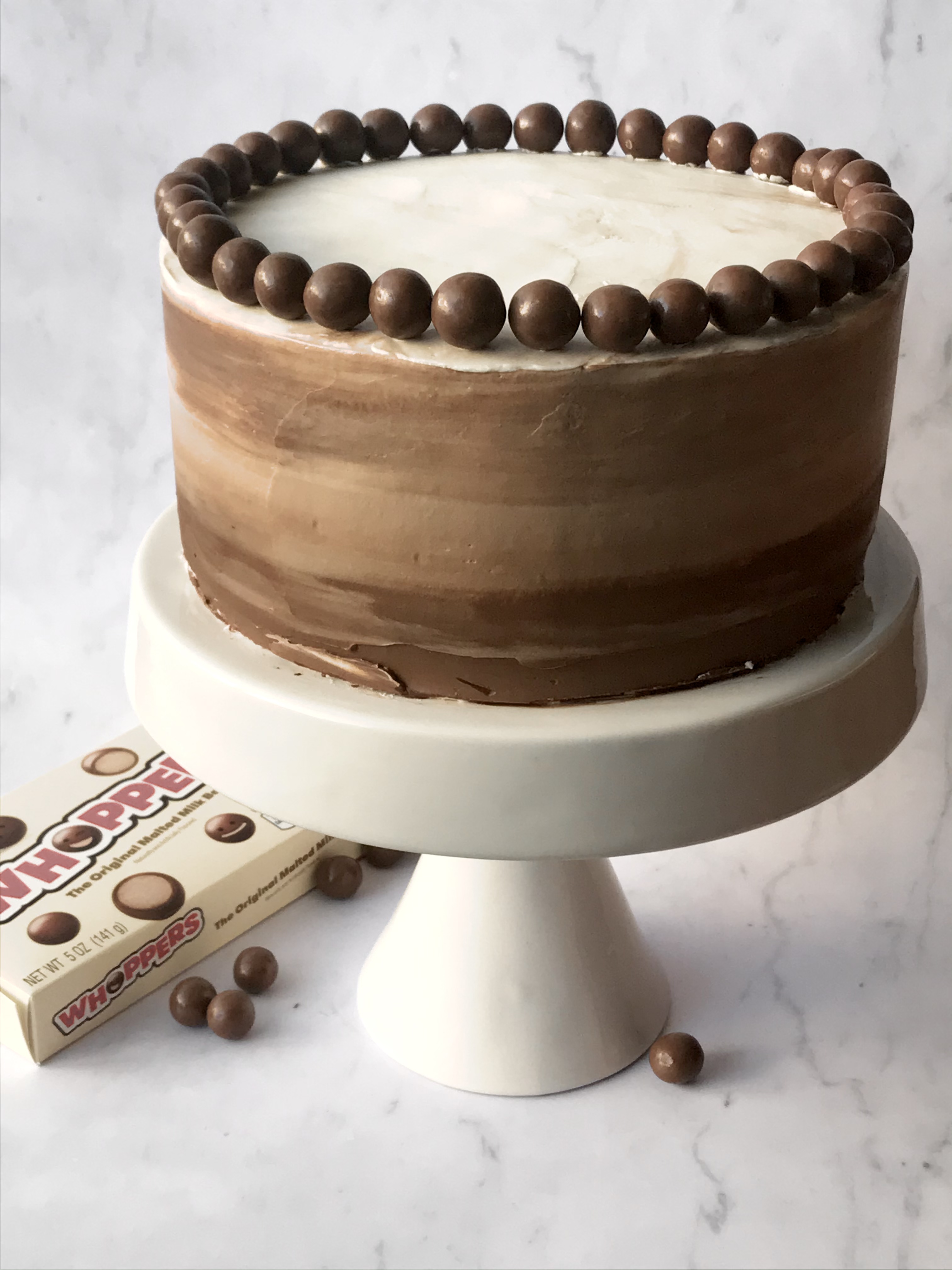To assemble the cake; Fill the first and second layers with 2 1/2 ice cream scoop size of buttercream and top with a generous grating of shaved chocolate using a large hole rasp, then top with some crushed whopper pieces. Top with the third cake layer and do a thin crumb coating of buttercream. Chill the cake for at least 30 minutes before finishing with the rest of your buttercream. Frost the top and sides first with the malted buttercream. To achieve the ombre effect; save one cup to 1 1/2 cup of buttercream, and in a small bowl combine with some of the melted chocolate to achieve a darker shade of buttercream, spread this along the bottom 2/3rds of the cake and using a bench scraper smooth. Dot the rest of the melted chocolate along the bottom of the of the cake about an inch worth and continue to smooth and scrape and add in any random spots of melted chocolate to you reach the desired effect. Top the cake along the border with whole whopper pieces. Chill until ready to serve and let the cake come to room temperature to serve.