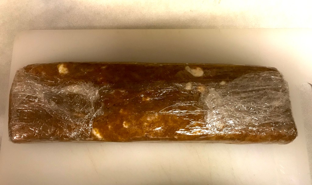(This is how the “log” will look once you shape it while in the plastic wrap; I also use a bench scraper to shape instead of my warm hands. Shape it into 10 1/2 inches long by 1 1/4 inch thickness x about 3 inches wide)