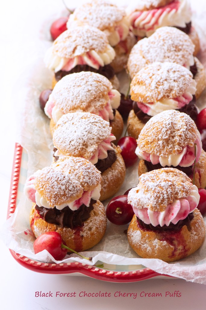 Cut off about 1/4 of a cooled puff and pipe a rosette of chocolate filling into the bottom of the puff. Then stuff 2 cherries down into the chocolate filling, and pipe another dab of filling on top of the cherries. Pipe a rosette of whipped cream and if serving right away; spoon a tiny amount ~ 1/4 tsp. of the reserved cherry syrup. Cap off with the top portion of the puff and dust with confectioners sugar. You can assemble them on a tray also about an 30 minutes before serving and put back into the fridge to keep cold. You can forgo the cherry syrup drizzle if you want a neater cleaner appearance but I happen to like the color it gives; you only need a tiny bit to achieve a small cascade of color.