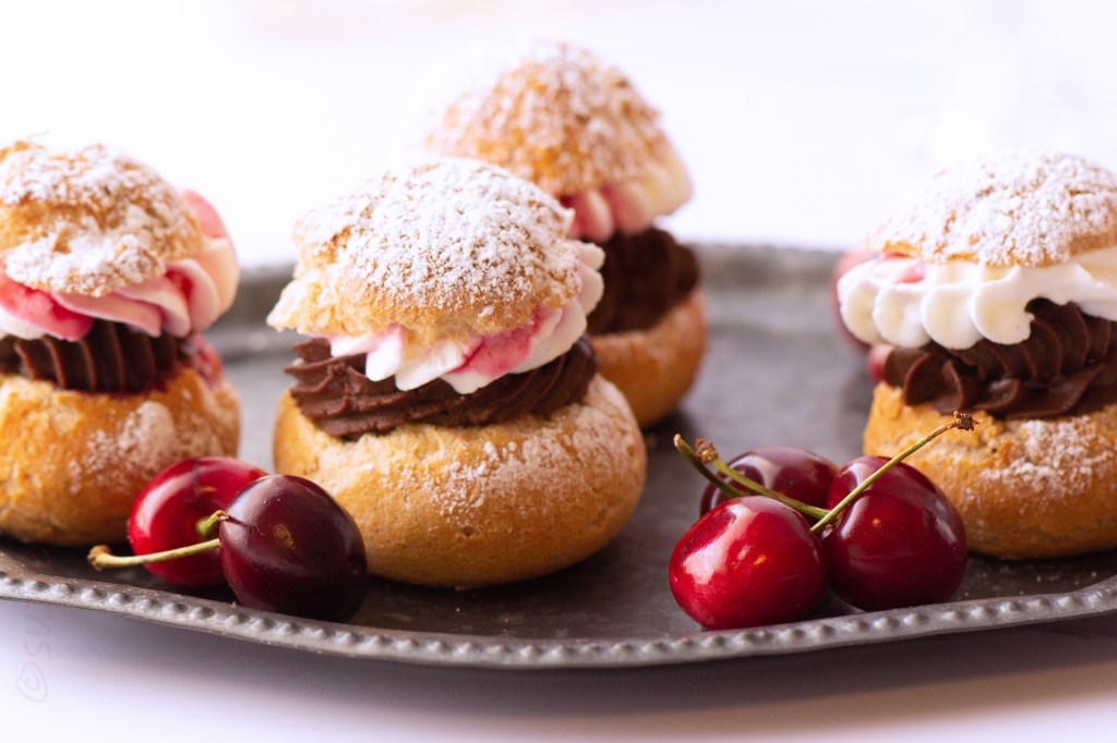 I feel like cream puffs don’t get as much love as they should. Their first cousin the eclair does, but not sure why the simple and understated cream puff does not. I’m about to change that; or a least try with this elegant recipe that uses the fresh harvest of cherries that are in stores right now. These puffs are great for a party as you won’t have to worry about slicing anything last minute. It also solves the annoying “just a sliver” request some people call for. #Sorrynotsorry . The flavor is very chocolate forward with some softened cooked cherries hiding inside the filling to give a nice burst of freshness and flair to break up all the rich chocolate. They are so dainty and small that some hungry men or women may even go for seconds. This I have witnessed firsthand. The recipe makes a dozen or bakers dozen, so nothing too crazy, but it can be easily doubled if you want to.