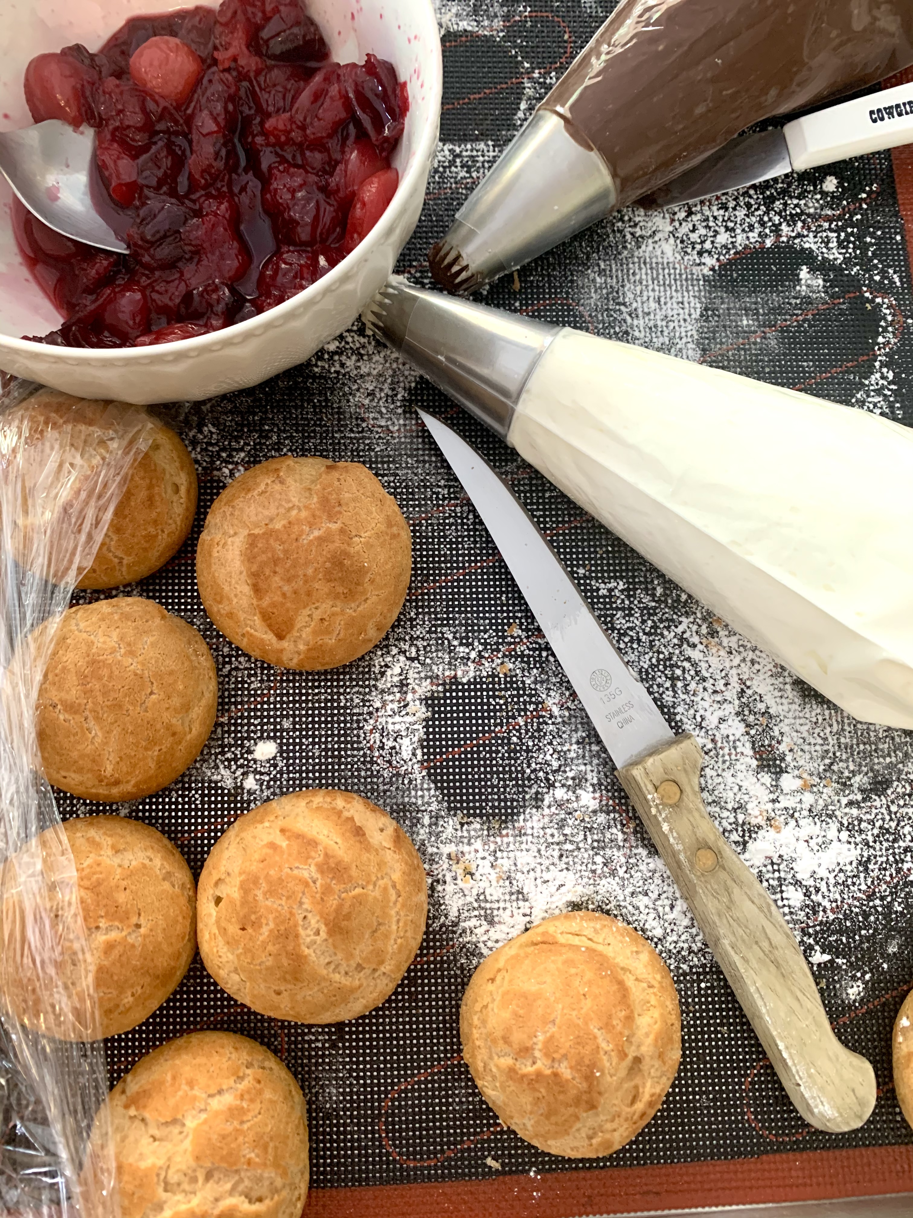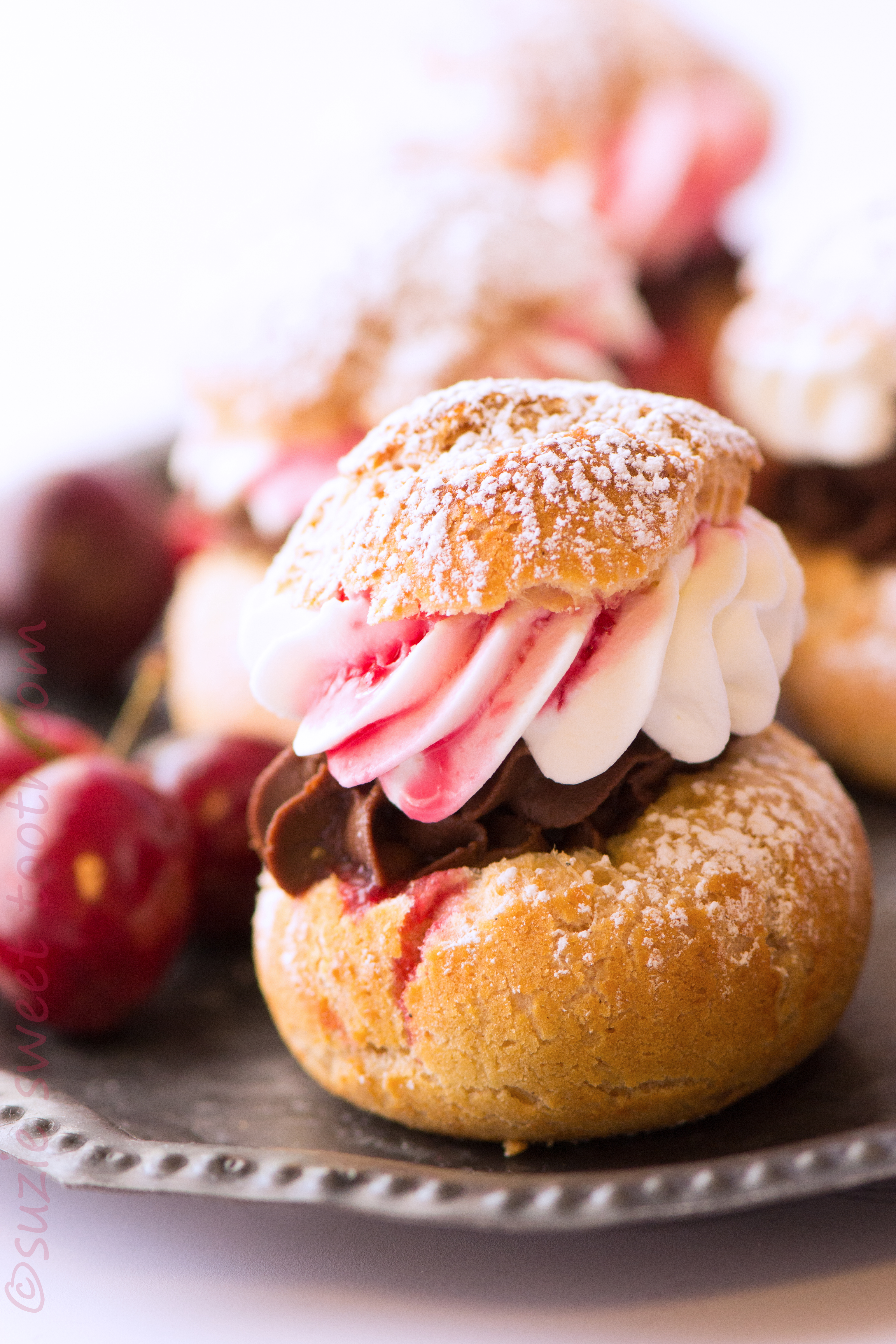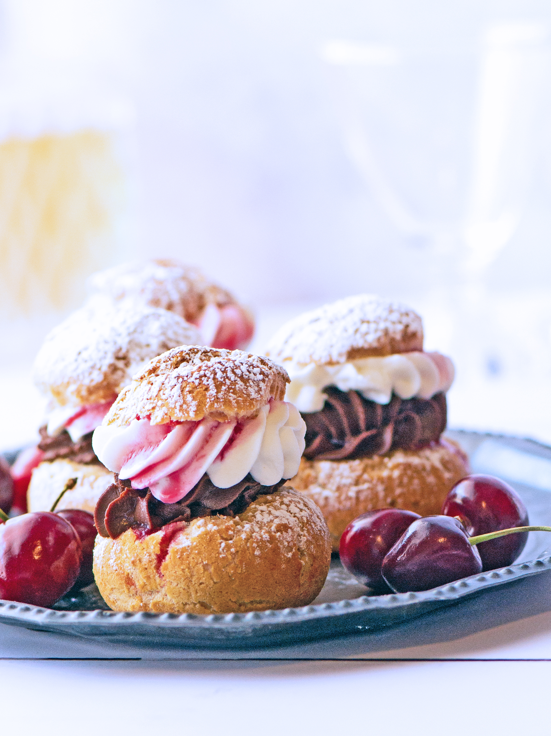 I feel like cream puffs don’t get as much love as they should. Their first cousin the eclair does, but not sure why the simple and understated cream puff does not. I’m about to change that; or a least try with this elegant recipe that uses the fresh harvest of cherries that are in stores right now. These puffs are great for a party as you won’t have to worry about slicing anything last minute. It also solves the annoying “just a sliver” request some people call for. #Sorrynotsorry . The flavor is very chocolate forward with some softened cooked cherries hiding inside the filling to give a nice burst of freshness and flair to break up all the rich chocolate. They are so dainty and small that some hungry men or women may even go for seconds. This I have witnessed firsthand. The recipe makes a dozen or bakers dozen, so nothing too crazy, but it can be easily doubled if you want to.