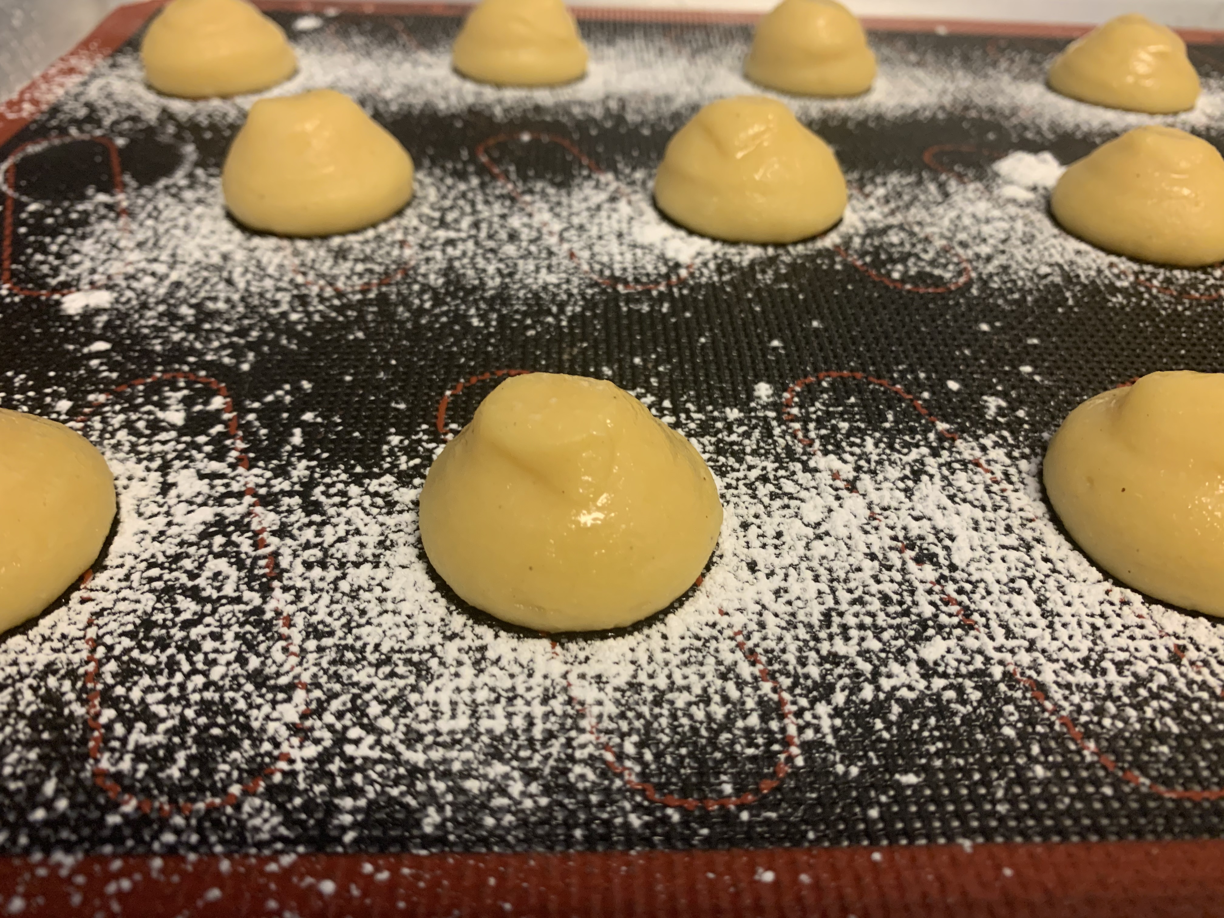 In a 3 quart saucepan or similar size place the milk, water, butter, sugar, salt, and spices if using . Bring to a full boil and remove from the heat and dump in all the flour at once. Return to a medium heat and stirring constantly with a wooden spoon, or heat proof spatula; heat the mixture for exactly five minutes. I use a motion of flattening the mixture to the bottom of the pan, then turning/or flipping over the dough back again to a flattened state, and repeating this continuously for five minutes. Why 5 minutes? it removes a lot of the steam so that you can add more eggs which helps create a nice crispy puff and helps the puffs rise better. As you are cooking the dough, the mixture will leave a film on the bottom of the pan (normal) and the don’t try to scrape up the hardened cooked film. After five minutes remove the dough mass from the pan; leave the dry film on the bottom behind; don’t attempt to scrape if off. Remove the dough ball and place into a stand mixer on stir setting [first setting on a kitchen aide] and stir the dough for exactly five minutes with the paddle attachment. This will help cool down the dough to just the right temperature so that you can add in the eggs gradually. Once the 5 minutes are up, increase the speed to medium and slowly add in a bit of the egg at a time, stopping and scraping both the sides and the bottom. Don’t beat the mixture at too high of a speed as you are tying to avoid incorporating too much air. I use just a medium speed. You are looking for a smooth dough that is somewhat sticky but the key is when you lift up the paddle attachment you see a “V” shape on the paddle. If the dough is too sticky; you’ve not added enough eggs in. See pic below. Stop several times and add in the eggs a little at a time until you see this “V”shape; it will depend on your environment and humidity etc. whether you’ll need the full amount of eggs. I live in Arizona desert and the day I made mine I actually ended up putting a wee bit extra . Place the dough into your prepared piping bag fitted with a large plain tip; I use an Ateco #809. Pipe round mounds of dough onto a silpat or parchment lined sheet approx. 1.5 inches in size. Tap down any peaks of dough with a dab of water on your finger. Sprinkle a light dusting of confectioners sugar over all the dough puffs once piped, and repeat another dusting one more time. Place in a preheated oven at 375 degrees F for 20 minutes, then reduce the temperature ; don’t open the door! and bake for another 20 minutes at 335 or something close to that degrees F; depending on if your oven ; I have a digital so I use 335 degrees, but keep watch on them. You are looking to dry them out on the inside a bit so they are not too doughy. I usually sacrifice one and slice open the top of one to check at around the 18 minute mark [slicing through as an equator motion]. If too doughy then keep baking a minute or two. Remove from the oven and allow to cool for a couple minutes until you can handle them and then poke with a wooden skewer through the top 1/4 portion going through to the other side to remove excess steam {this helps them not deflate}. Allow to cool completely over a wire rack before filling.