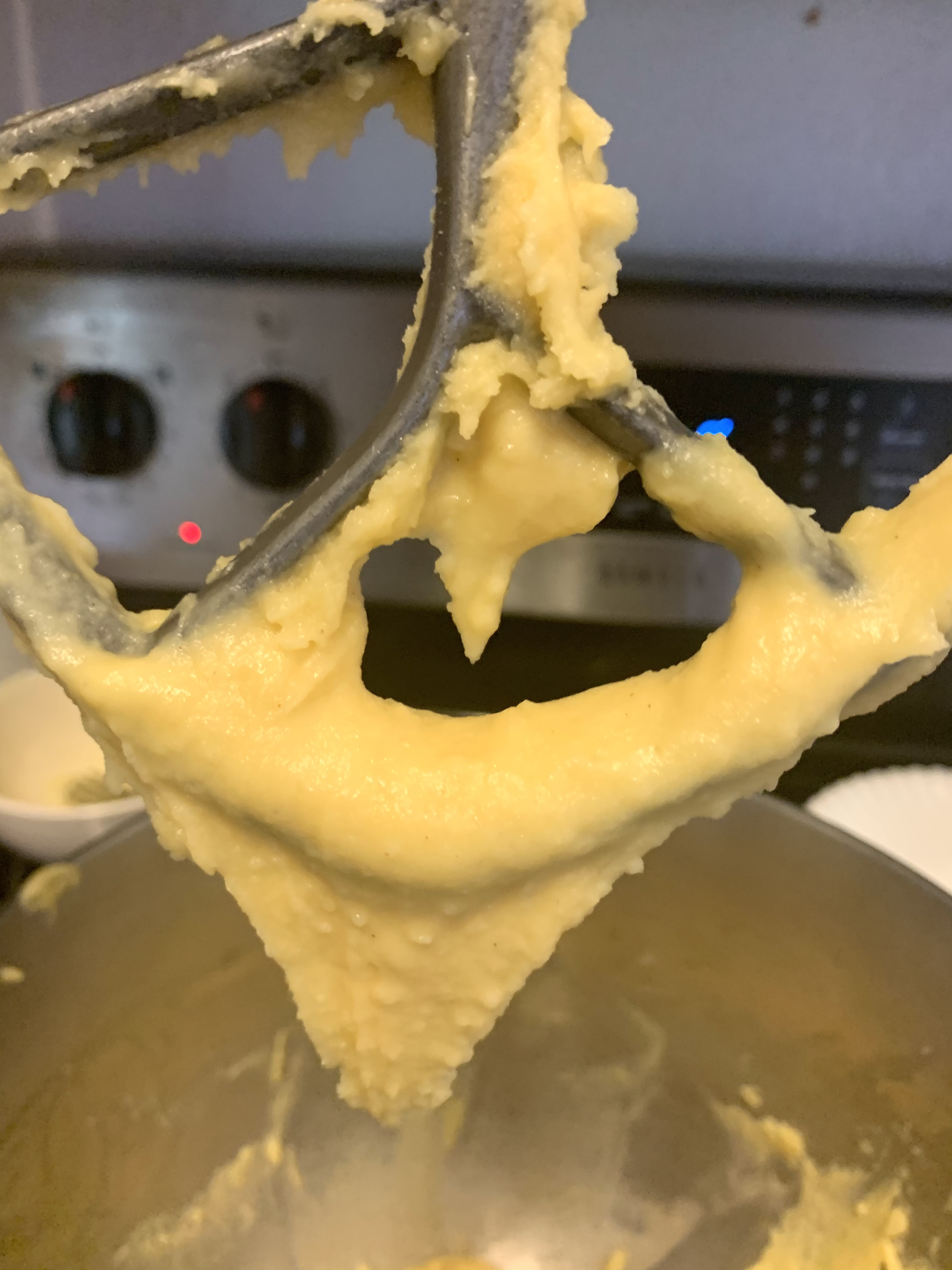 V shape: This is is the consistency you are looking for when you pull the paddle up out of the dough; you are looking for the classic V shape. Once you reach this; don’t add anymore eggs.
